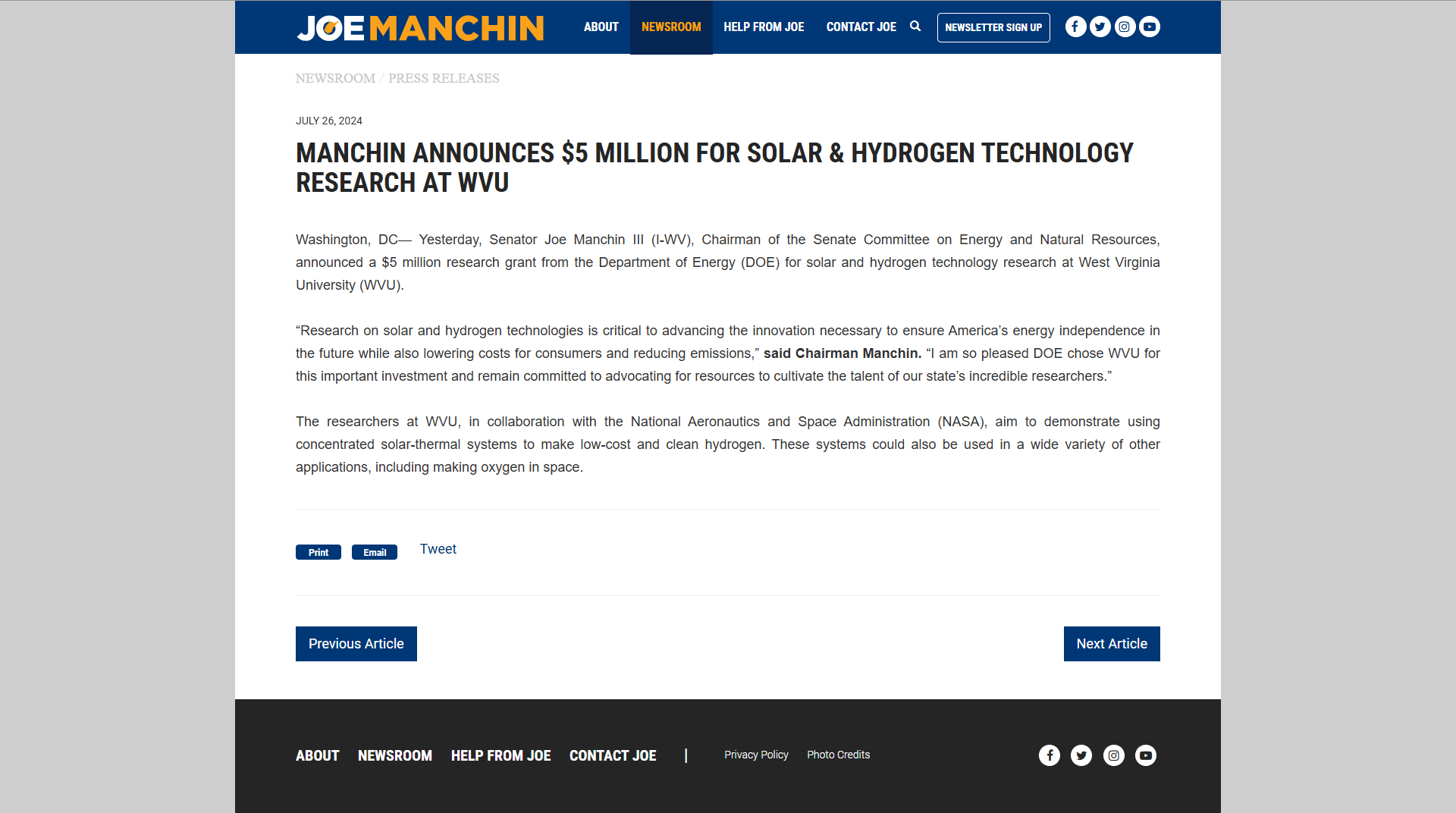 July, 2024 - Washington, DC— Yesterday, Senator Joe Manchin III (I-WV), Chairman of the Senate Committee on Energy and Natural Resources, announced a $5 million research grant from the Department of Energy (DOE) for solar and hydrogen technology research at West Virginia University (WVU).